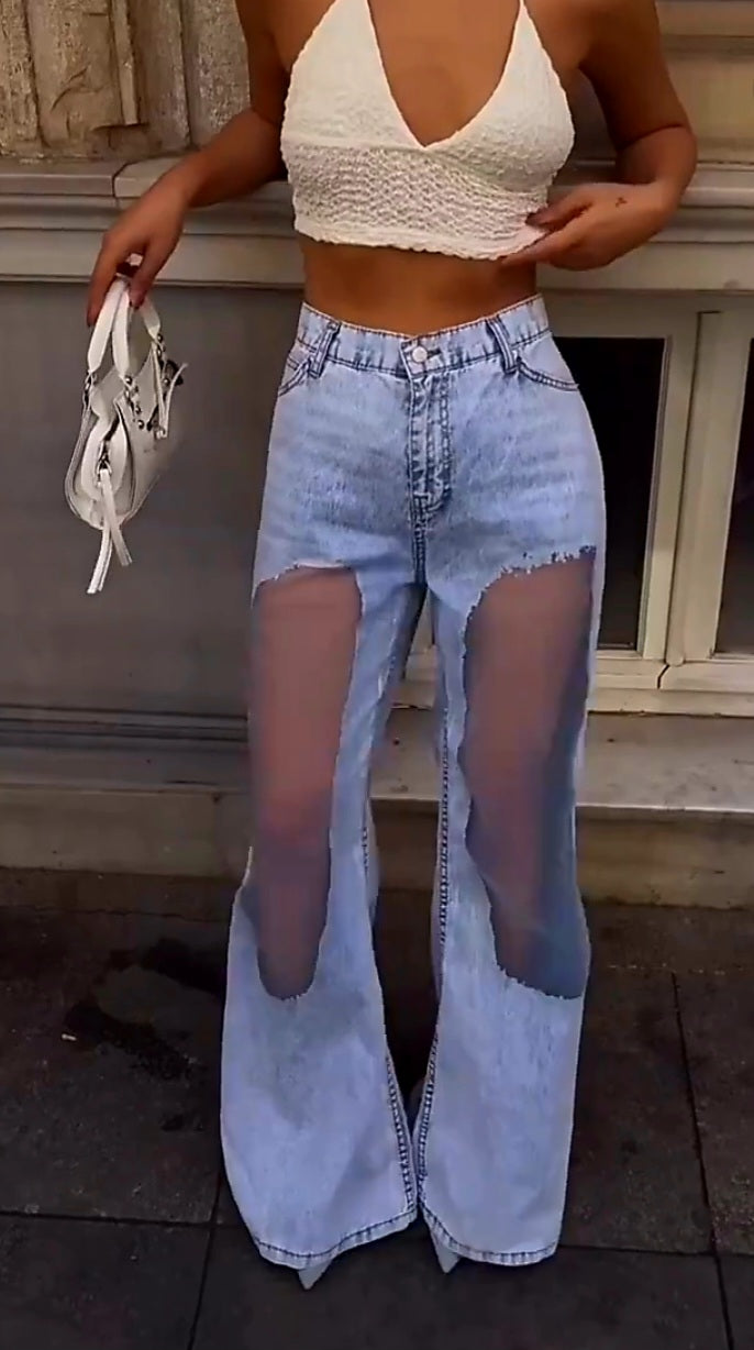 Discover the elegance of innovation with these Clear Mesh Denim Jeans. Combining traditional denim craftsmanship with a delicate mesh overlay, they offer a refined silhouette that balances structure and lightness. Perfect for a sophisticated look that effortlessly blends classic style with modern flair.