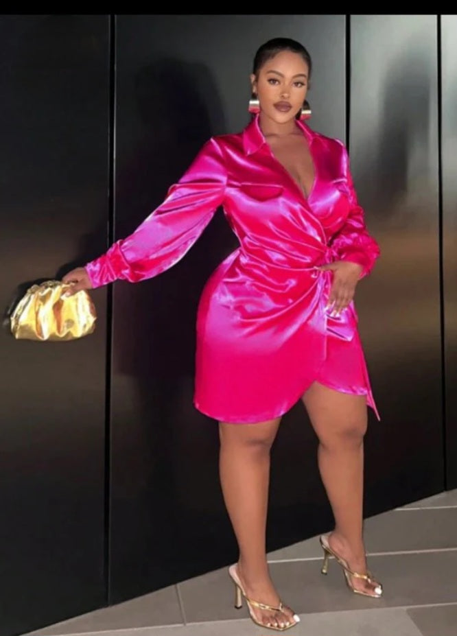 This Satin Fushia wrap dress, designed to flatter every silhouette with its tailored fit and graceful drape. The lustrous satin fabric enhances richness and sophistication, while the vibrant fuchsia hue adds a bold touch of refined color. Perfect for evening events or special occasions, this dress combines comfort with chic style for a timeless, confident look.